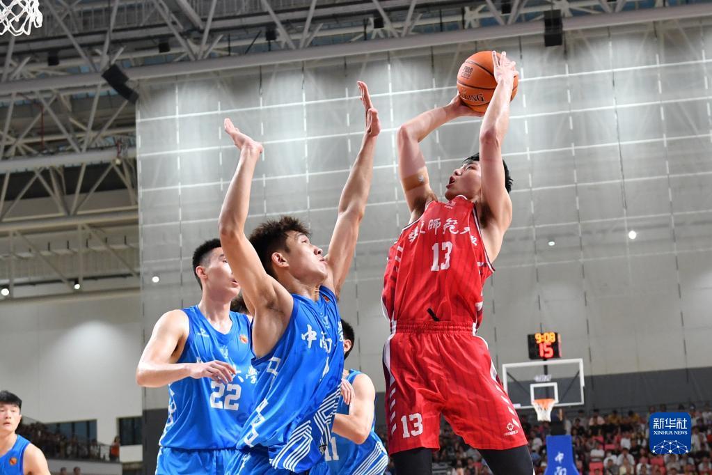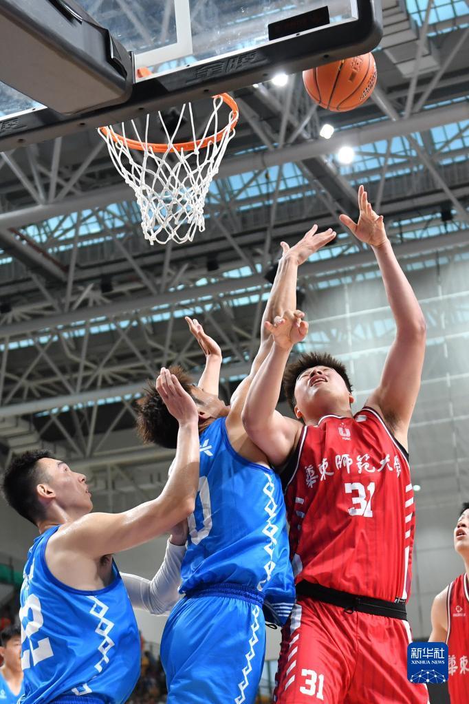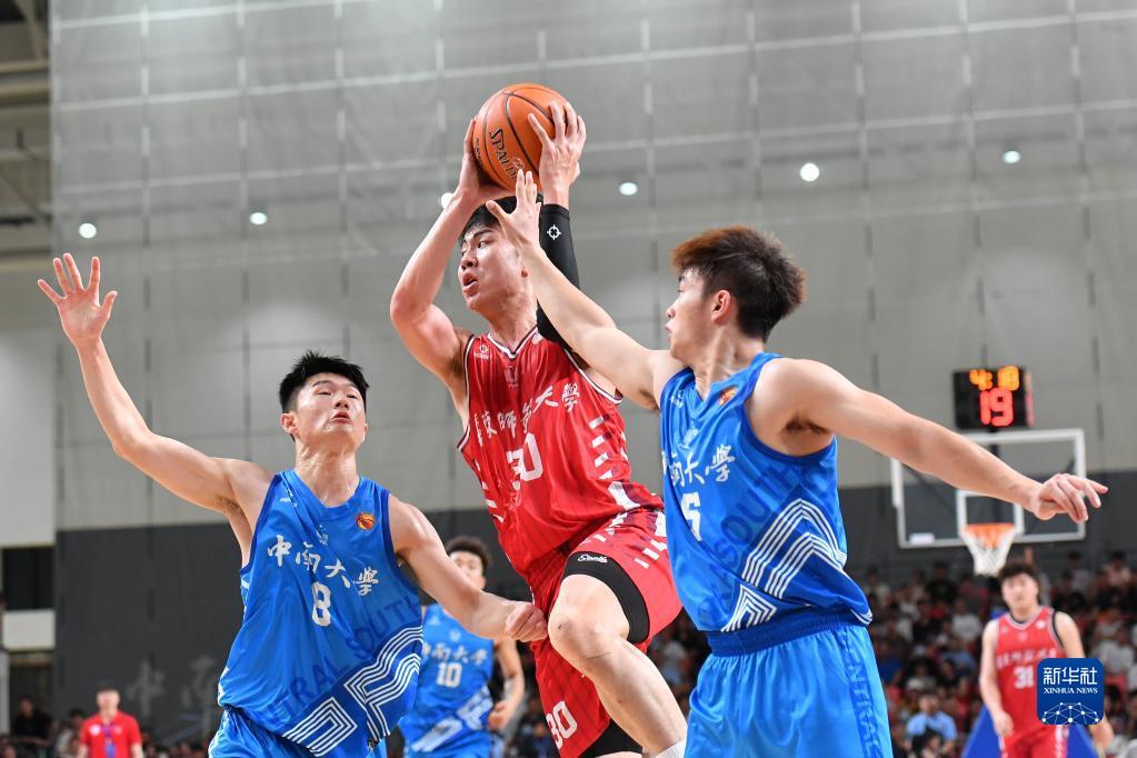 5月27日,华东师范大学队球员卢嘉俊(右一)在中南大学队球员赵中兴(右二)的防守下投篮。新华社记者 陈振海 摄