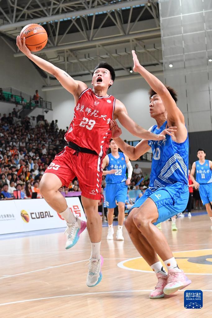 5月27日,华东师范大学队球员丁超(左)在中南大学队球员赵中兴防守下上篮。新华社记者 陈振海 摄