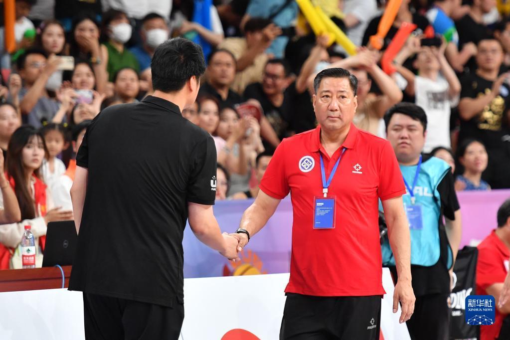 5月27日,中南大学队主教练白江(右)赛后和华东师范大学队主教练孙柳青握手。新华社记者 陈振海 摄