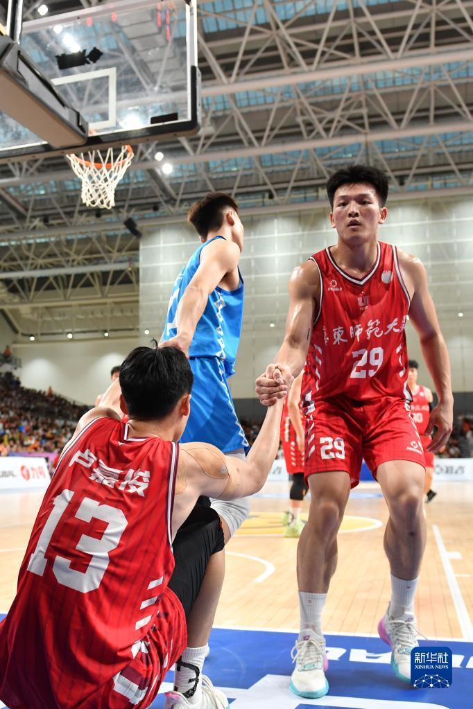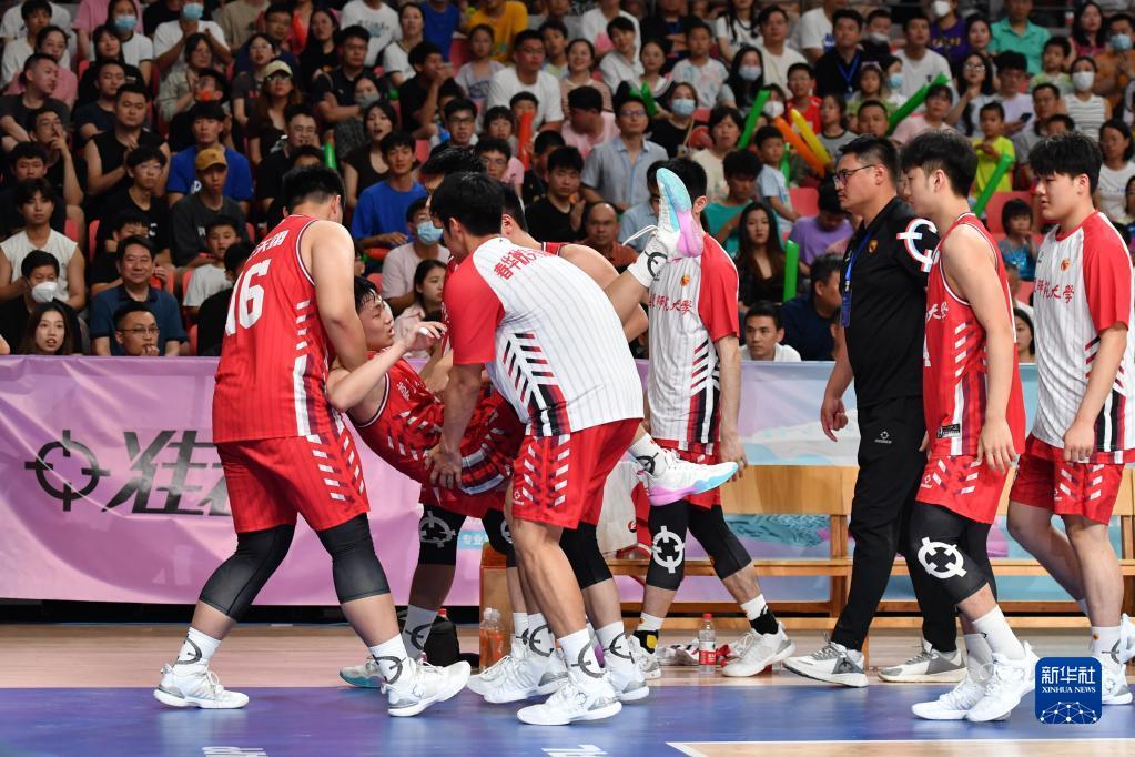 5月27日,华东师范大学队球员丁超(右)、中南大学队球员王子琛(中)在比赛中拉起华东师范大学队球员卢嘉俊。新华社记者 陈振海 摄