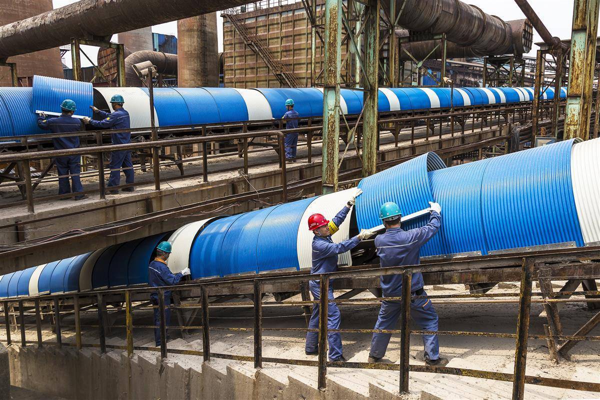 2019年5月9日,武钢有限炼铁厂三原料作业区职工正在安装新防尘罩,目前已完成2万余米皮带料线防尘罩更换任务。