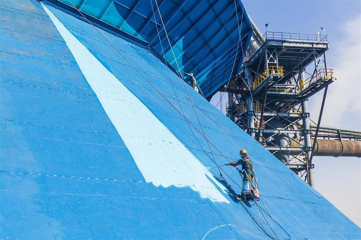 2021年11月23日,施工人员正在对炼铁厂6号高炉顶棚进行彩绘喷涂。