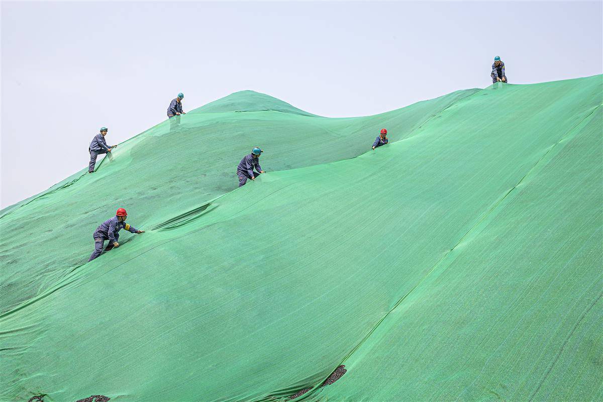 2019年4月25日,职工们正在对输入四作业区陆运料场矿堆进行苫盖。武钢有限炼铁厂原料料场为露天堆取料模式。近年来,公司加快环保突出问题整治,大力推进料场封闭改造、料堆苫盖、雾炮降尘等环保举措。