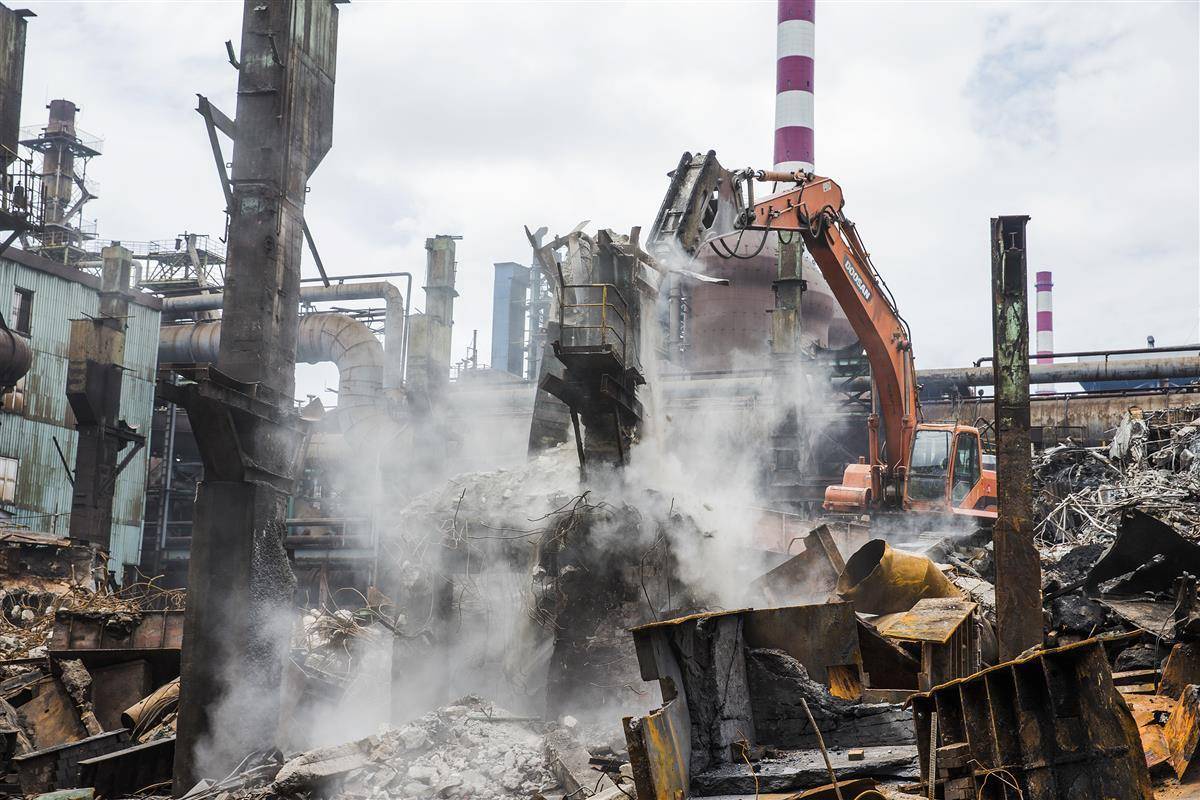 2017年6月6日,工人正在破拆施工。化解过剩产能,武钢二号高炉停产拆除。
