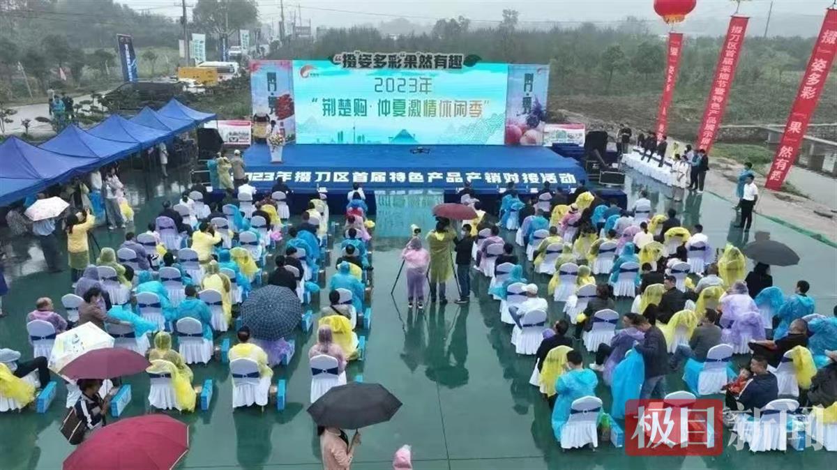 极目新闻记者在活动现场看到,掇刀区各镇、街道推荐的农特产品齐聚展销会,40多家农业企业、农民合作社带来了蓝莓、桃子、风干鸡、牛肉、甲鱼、辣椒酱等百余种时令果蔬和民俗产品,掇刀特色农副产品精彩亮相,众多市民和村民闻讯前来采摘果蔬、购买农特产品,在蒙蒙细雨中尽享融融乐趣。
