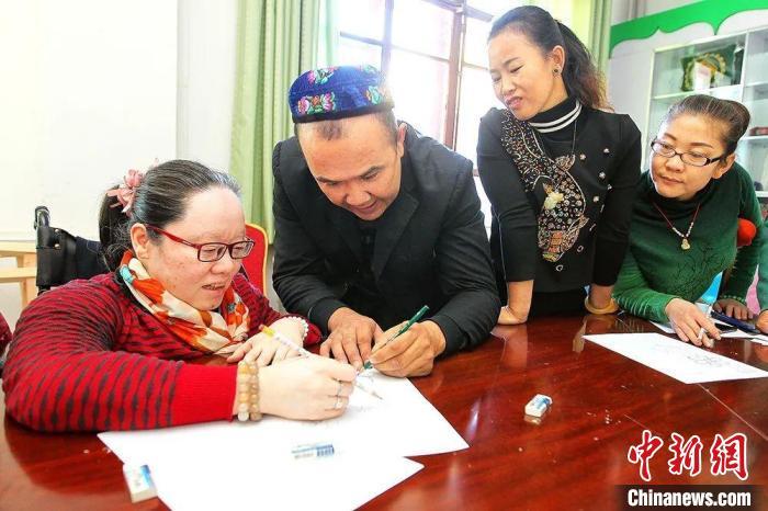 卡德尔·热合曼指导绣娘画图。 受访者供图