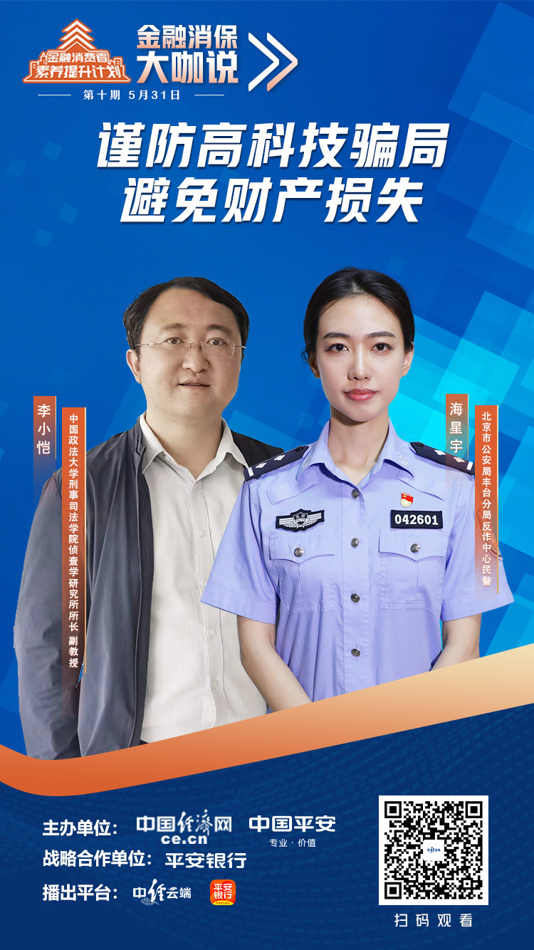中国经济网北京5月31日讯 由中国经济网联合中国平安推出的《金融消保大咖说》节目于今日播出,本期节目的话题是“谨防高科技骗局 避免财产损失”。中国政法大学刑事司法学院侦查学研究所所长、副教授李小恺提醒大家警惕新型电信网络诈骗手法。