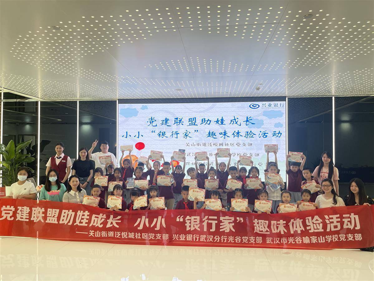 湖北日报讯 (通讯员桂阮芳、周泓)在六一儿童节来临之际,5月30日下午,武汉关山街泛悦城社区党支部联合辖区商业街兴业银行武汉分行光谷支行党支部,举办了一场“共庆六一 我是小小银行家”金融体验活动,邀请共建单位光谷喻家山学校30多名小学生及老师参加。