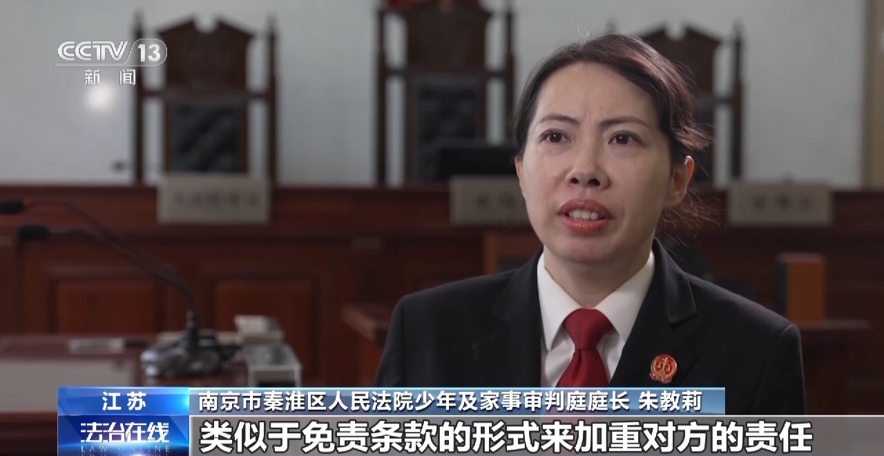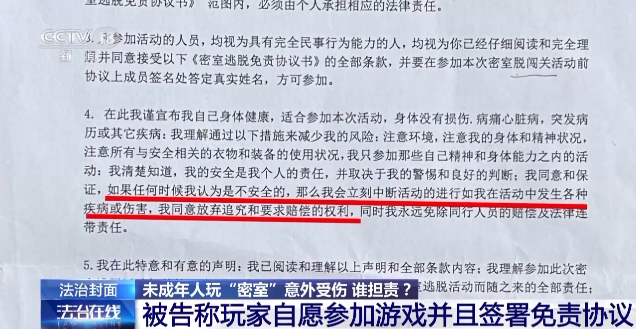 南京市秦淮区人民法院少年及家事审判庭庭长 朱教莉:免责协议书的主要内容其实是,对于可能发生的一些伤害,全部免除被告方的责任,签署了这样的一个免责协议,才可以参加到这样的游戏。