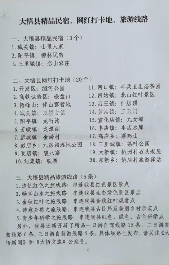“5·19中国旅游日”,县文旅局发布大悟追忆红色之旅等5条精品旅游线路,山里人家等3个精品民宿,碾盘山孔雀山庄等20个网红打卡地。