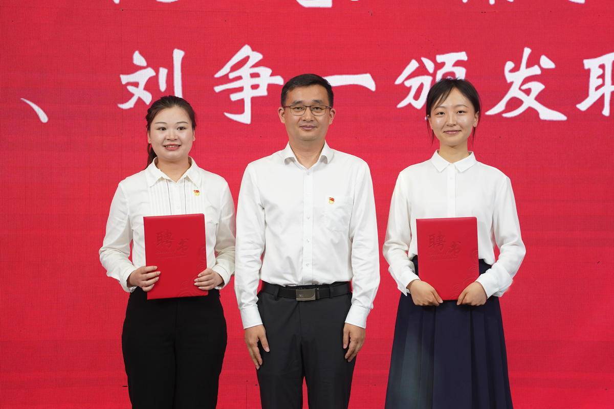 团省委副书记蔡伟伟(中)同志为省档案馆少先队校外辅导员代表刘争一(左一)、张佳慧(右一)颁发了聘书。