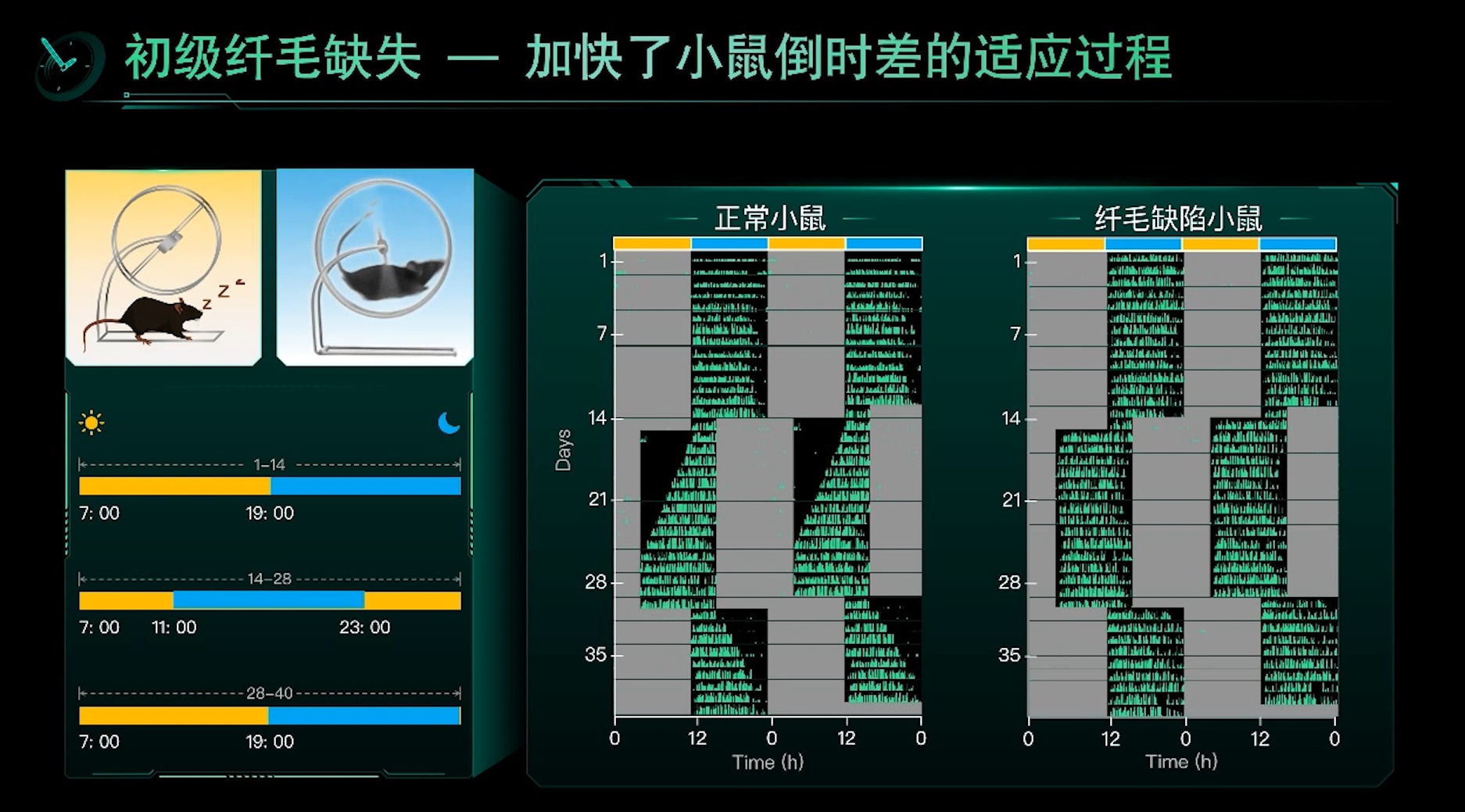 科研人员进行了小鼠的倒时差实验,正常小鼠需要7-9天才能适应新的时间周期,而实验小鼠仅需1-2天就适应了新的时间周期。此项发现为节律调控新药研发开辟了全新路径。今天,我国科学家发现特定神经元的纤毛是调控节律的细胞器,这一原创性发现发表在国际权威学术期刊《科学》,让科研人员为后续发现药物、解决相关健康问题更加充满信心,为节律紊乱所致疾病的治疗提供了原理遵循。