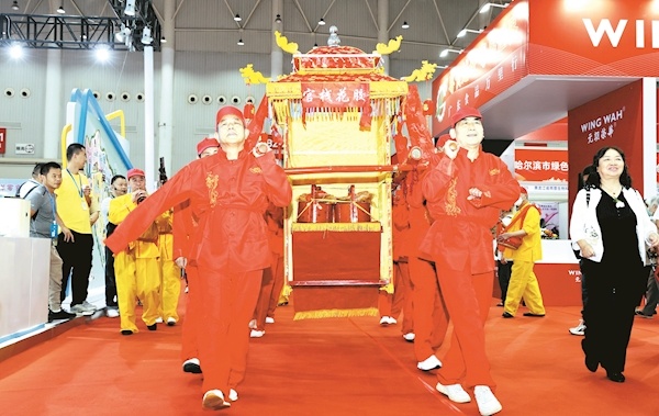 6月3日上午10时许,在武汉国际博览中心B2馆,随着高亢的唢呐声和铜锣声同时响起,洪亮的“起轿”声中,8名轿夫抬起一顶大红花轿,轻快地颠动起来,引来众多观众驻足围观。