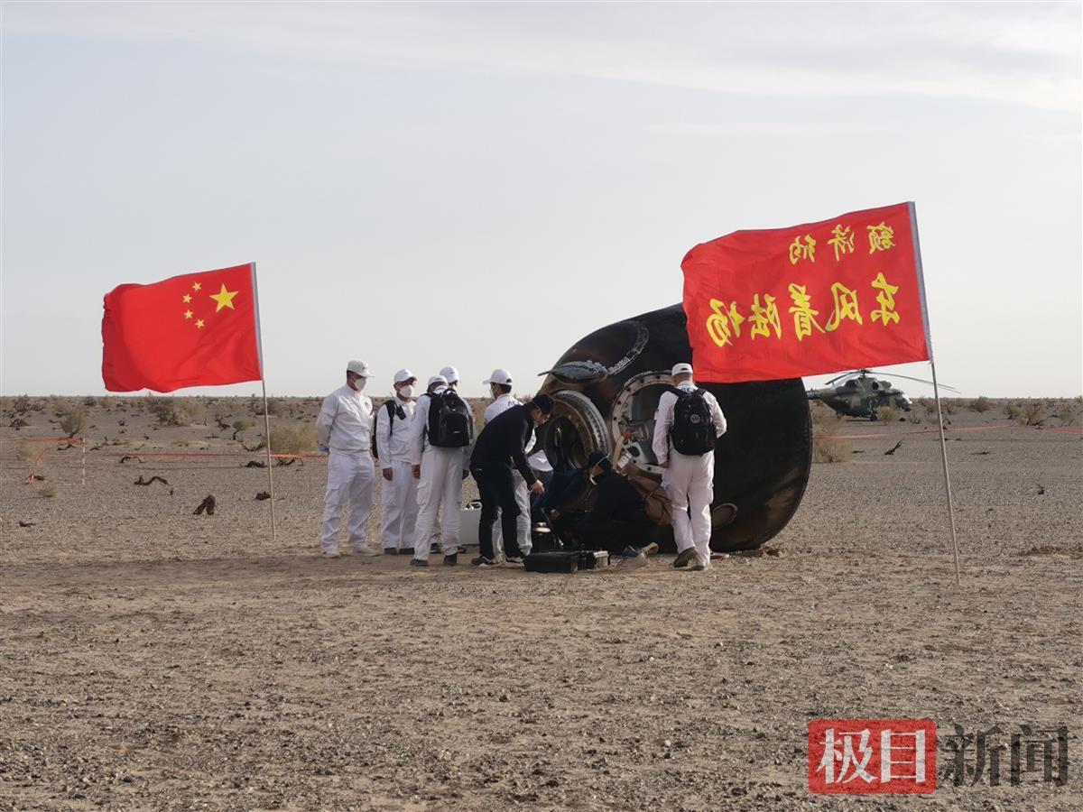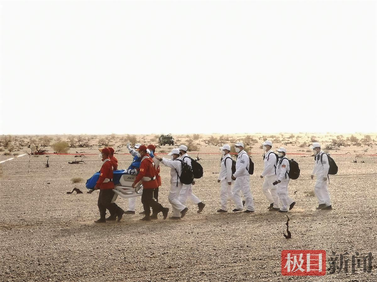 一路上,地面搜救车队疾驰向前,烟尘滚滚。早已待命的四架搜救直升机螺旋桨轰鸣。随着直升机缓缓降落至返回舱附近,身着橘黄色搜救服的航天搜救队员迅速展开无水肼检测、警戒区建立、便携站架设等工作。
