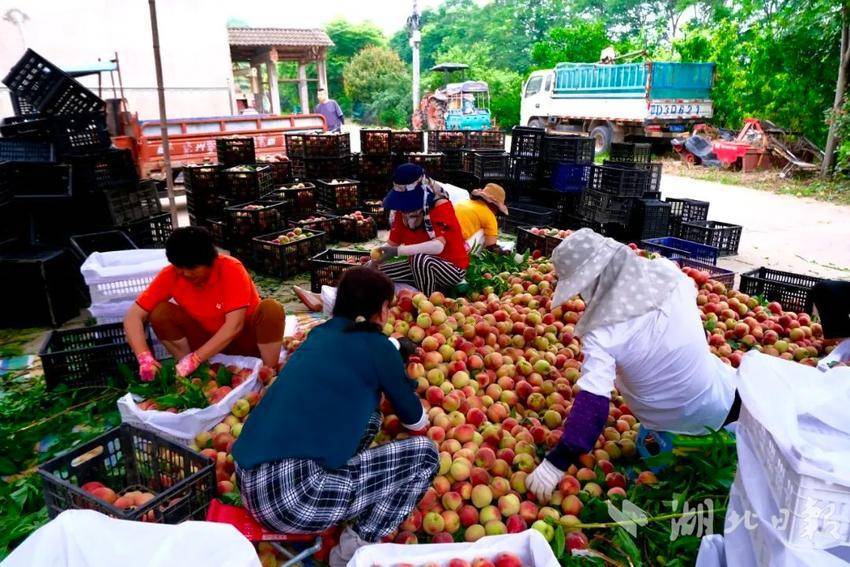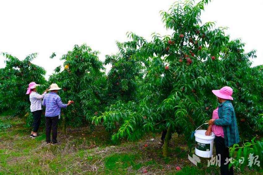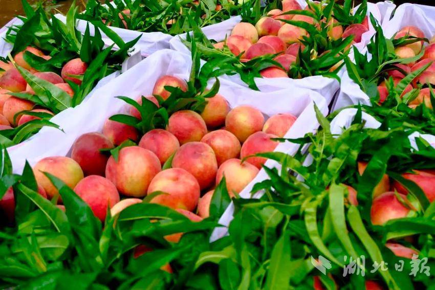 湖北日报客户端讯(通讯员 张子翰 欧艳阳)桃花四散飞,桃子压枝头。走进松滋市老城镇大堰头村的桃园基地,一棵棵桃树上挂满了鲜红脆甜的桃子,果香诱人,果农们穿梭其中,忙着采摘、分拣、运送……丰收的喜悦溢满果园。