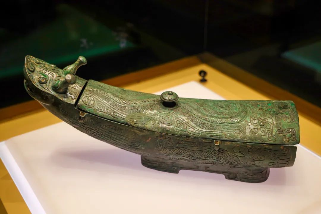 △山西省博物院文物龙形觥,是商代晚期“方国”青铜文化的代表作品。觥,是一种盛酒器,器身的两侧发现饰有鼍纹和夔龙纹,特别是鼍纹在青铜器中极为少见,鼍即扬子鳄。