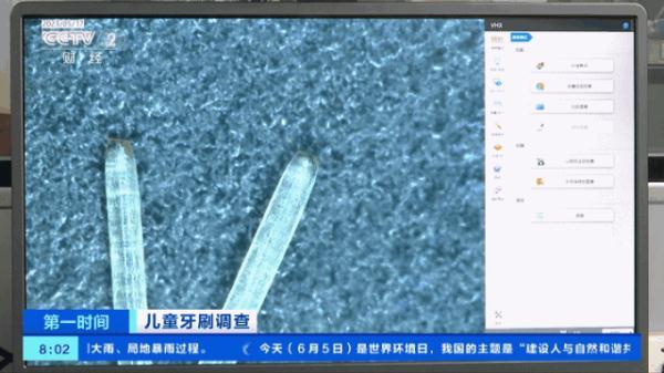 检测工程师们依据牙刷新国标的要求,首先对儿童牙刷的磨毛指标进行检测。在显微镜下可以看到,合格的牙刷刷毛圆润饱满;不合格的刷毛顶端尖锐有毛刺。