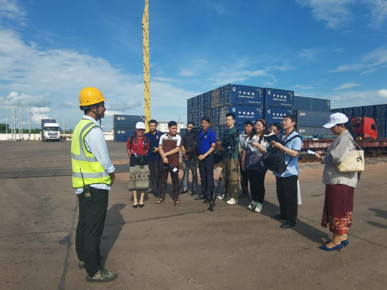 图为人民日报和老挝媒体记者在万象南站集装箱堆场联合采访。人民网记者 杜明明摄