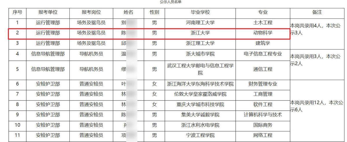 5月22日,温州机场集团在其官方网站上公示了一份2023年春季招聘拟录用人员名单,其中浙江大学动物科学专业的陈某某,被录用为“场务及驱鸟员”,引发关注。6月6日,温州机场集团工作人员在接受采访时表示,本次招聘有专门的笔试、面试,各岗位学历均要求大学本科及以上。“不是赶鸟那么简单,不会大材小用。”该工作人员称,基层工作人员依据个人工作表现情况,日后也会有晋升通道,并可能进入管理层。