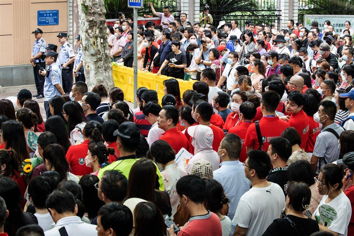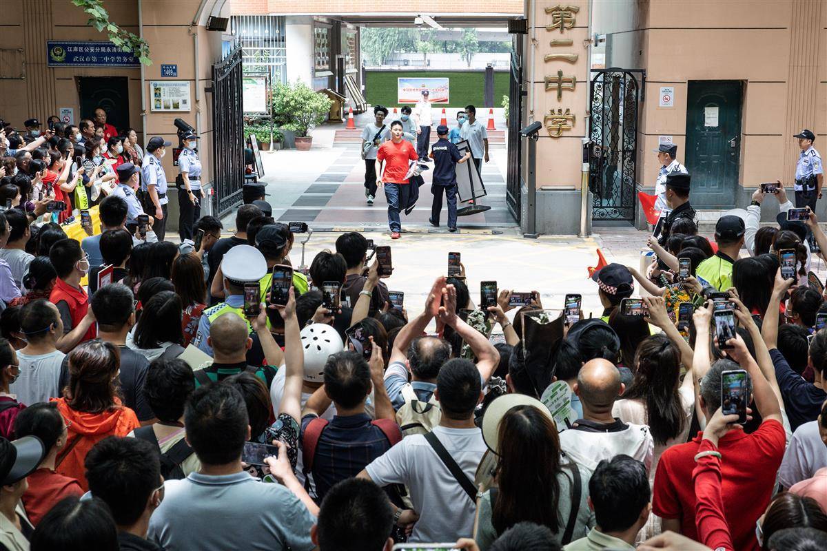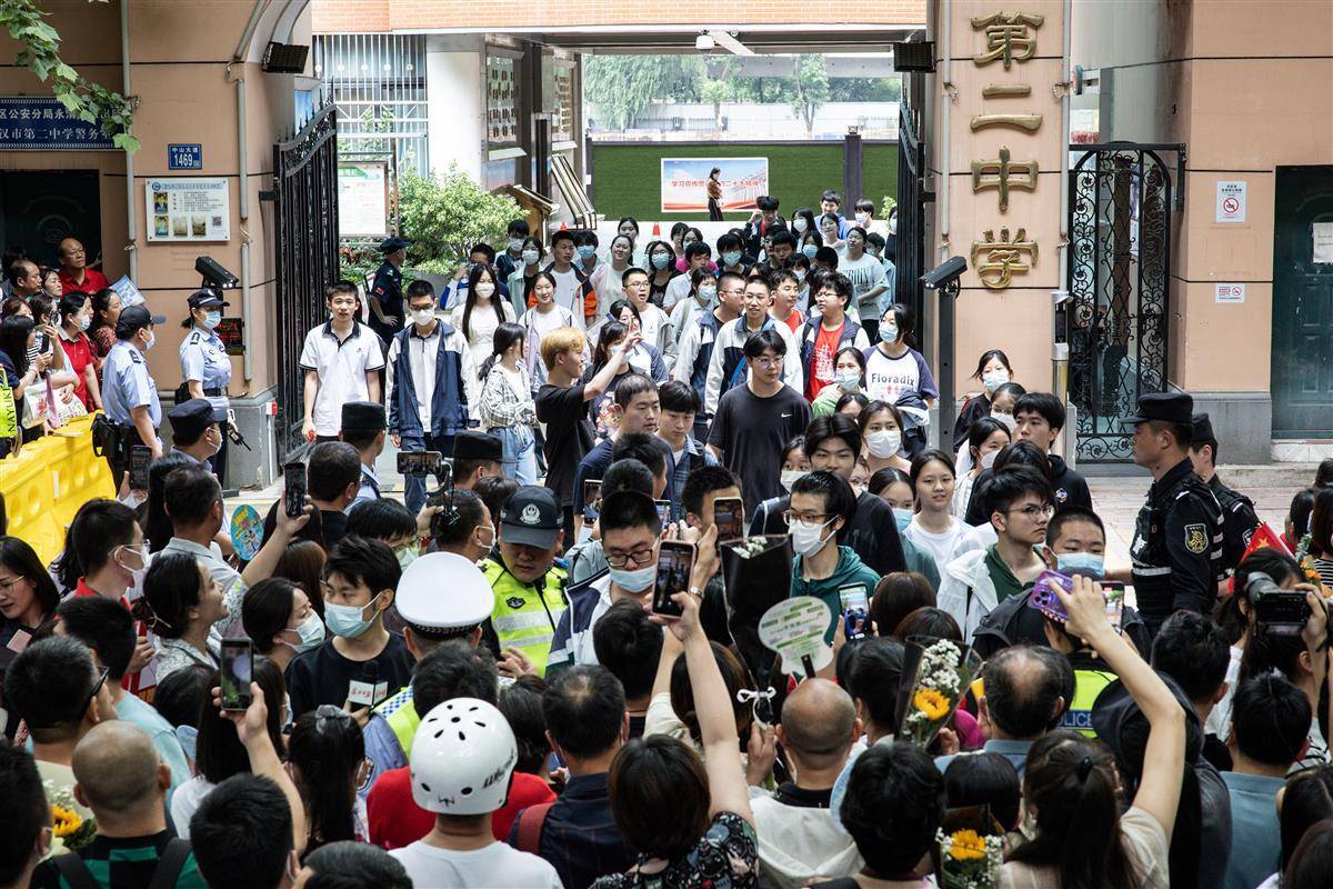 6月7日中午,在武汉市第二中学考点,高考首场考试结束,考生们走出考场,考场外守候着的家长们手捧鲜花迎接着考生们放考。今天是2023年全国高考第一天,众多的高三学子将在考场实现自己的人生梦想。