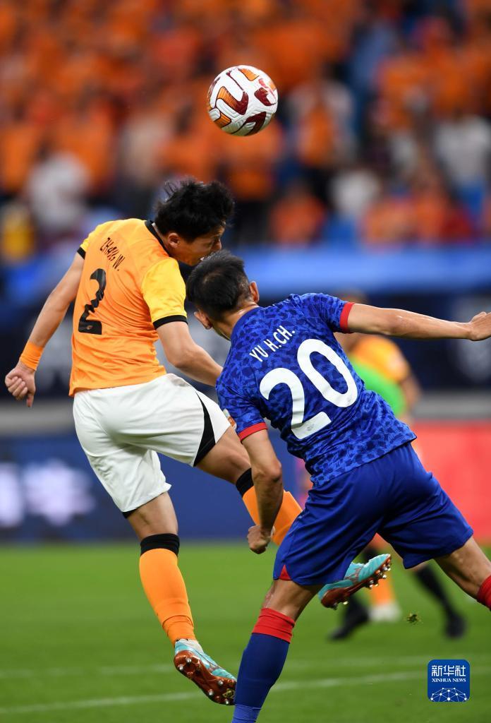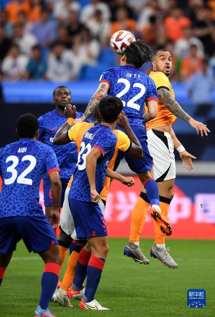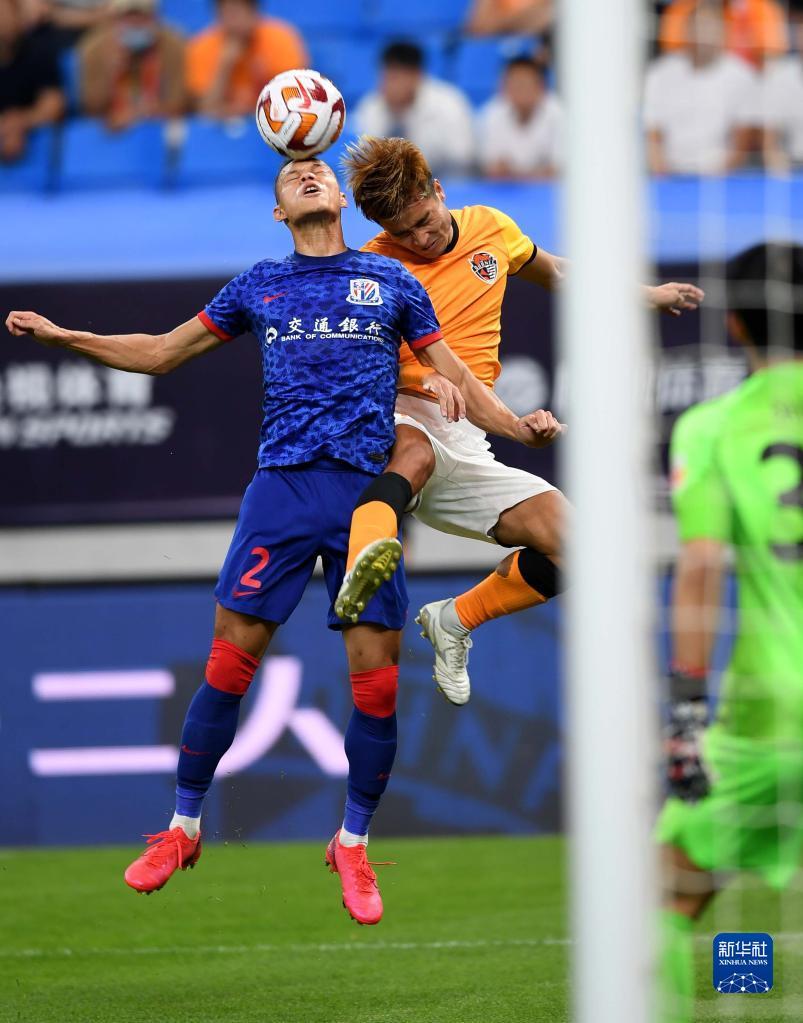 6月8日,上海申花队球员金洋洋(右二)在比赛中争顶。新华社记者 李紫恒 摄