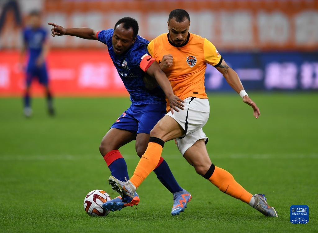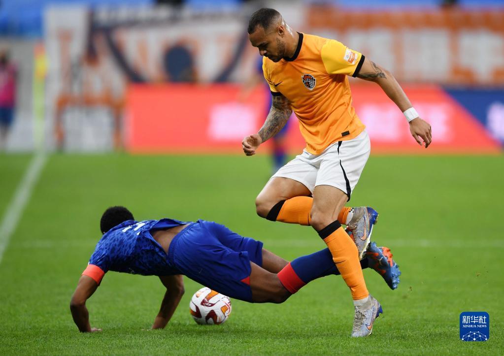 6月8日,青岛海牛队球员福布斯(左一)在比赛中防守上海申花队球员进攻。新华社记者 李紫恒 摄
