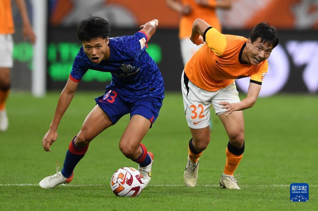 6月8日,上海申花队球员汪海健(左)在比赛中与青岛海牛队球员龙威拼抢。新华社记者 李紫恒 摄