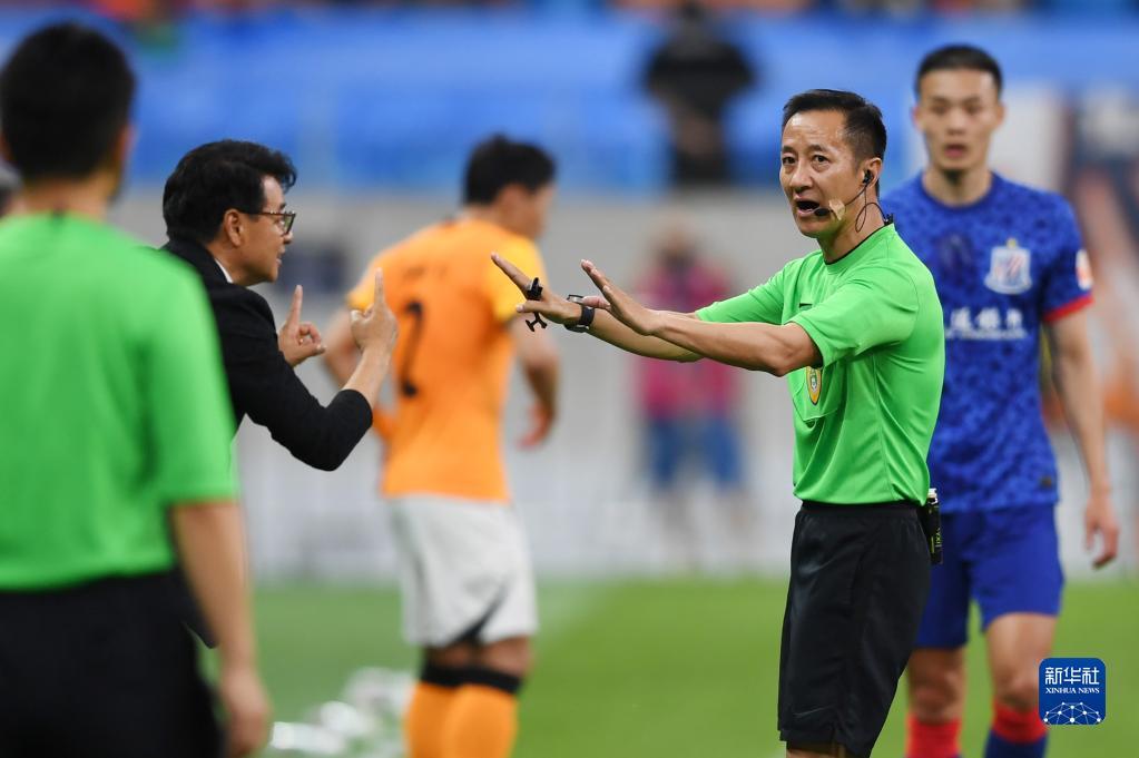 6月8日,本场比赛主裁判马力(右二)在比赛中与上海申花队主教练吴金贵交流。新华社记者 李紫恒 摄