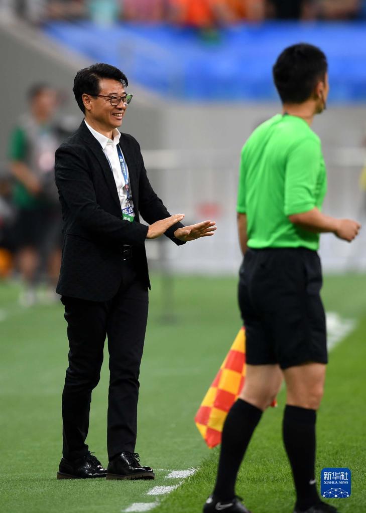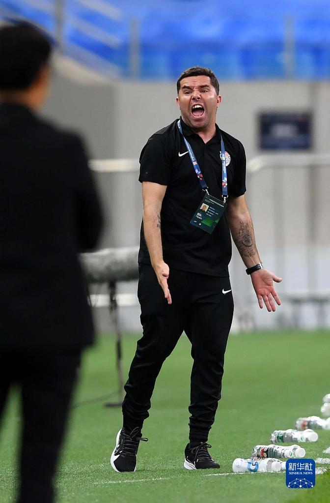 6月8日,青岛海牛队主教练戈麦斯在比赛中与裁判员交流。新华社记者 李紫恒 摄