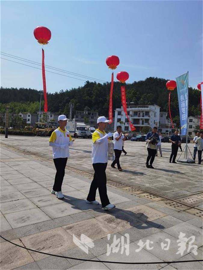 火种护卫将5斤重的火种灯挂上无人机,无人机旋转四翼,腾空而起,向直线距离7公里外的活动主会场——九资河镇河西畈游客中心飞翔而去。