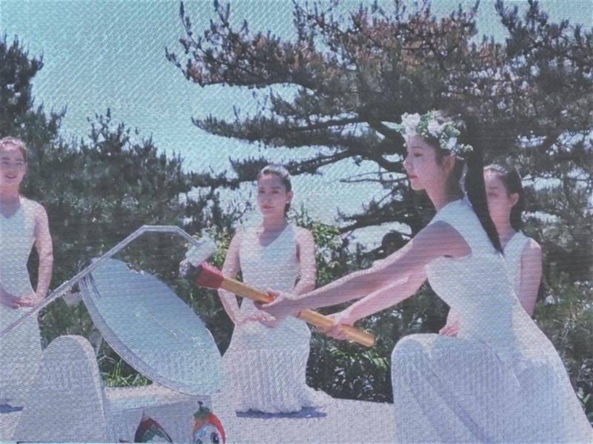 县一中学生王思贝担任采火少女,她身穿白色长裙,缓步行进至采火器前,将采火棒轻轻探出至取火点。10秒钟后,采火棒顺利点燃。6名女伴簇拥在她身边,共同迎接圣火。