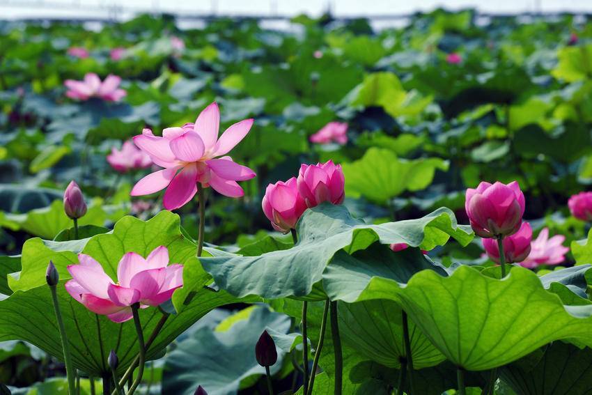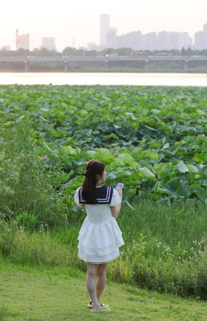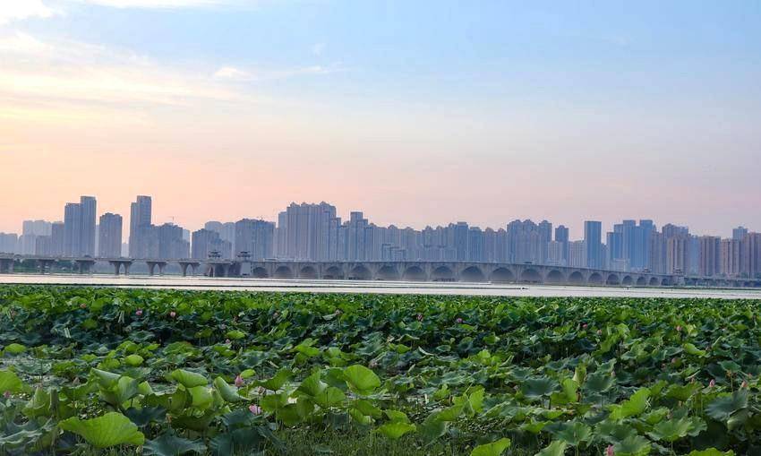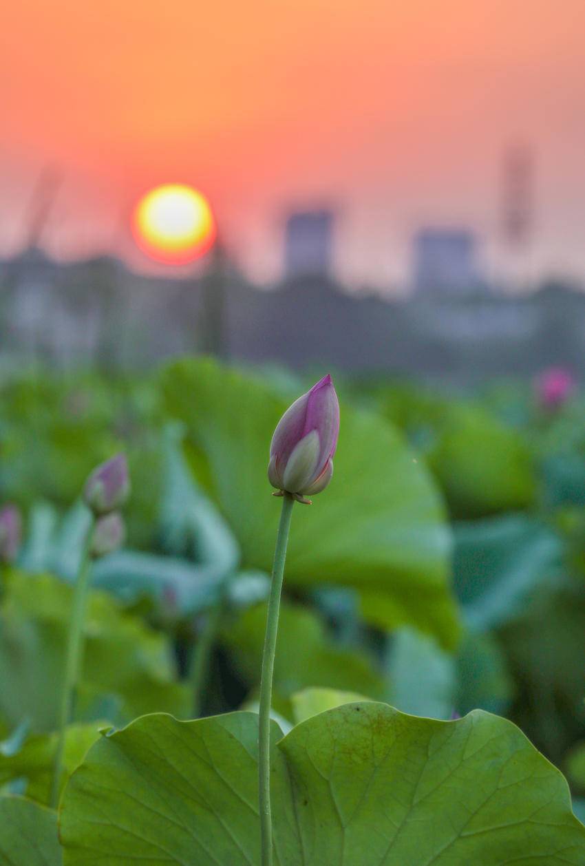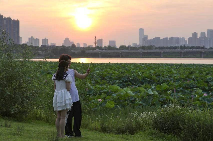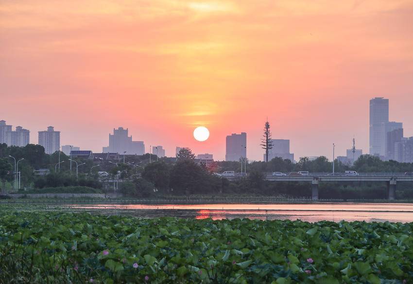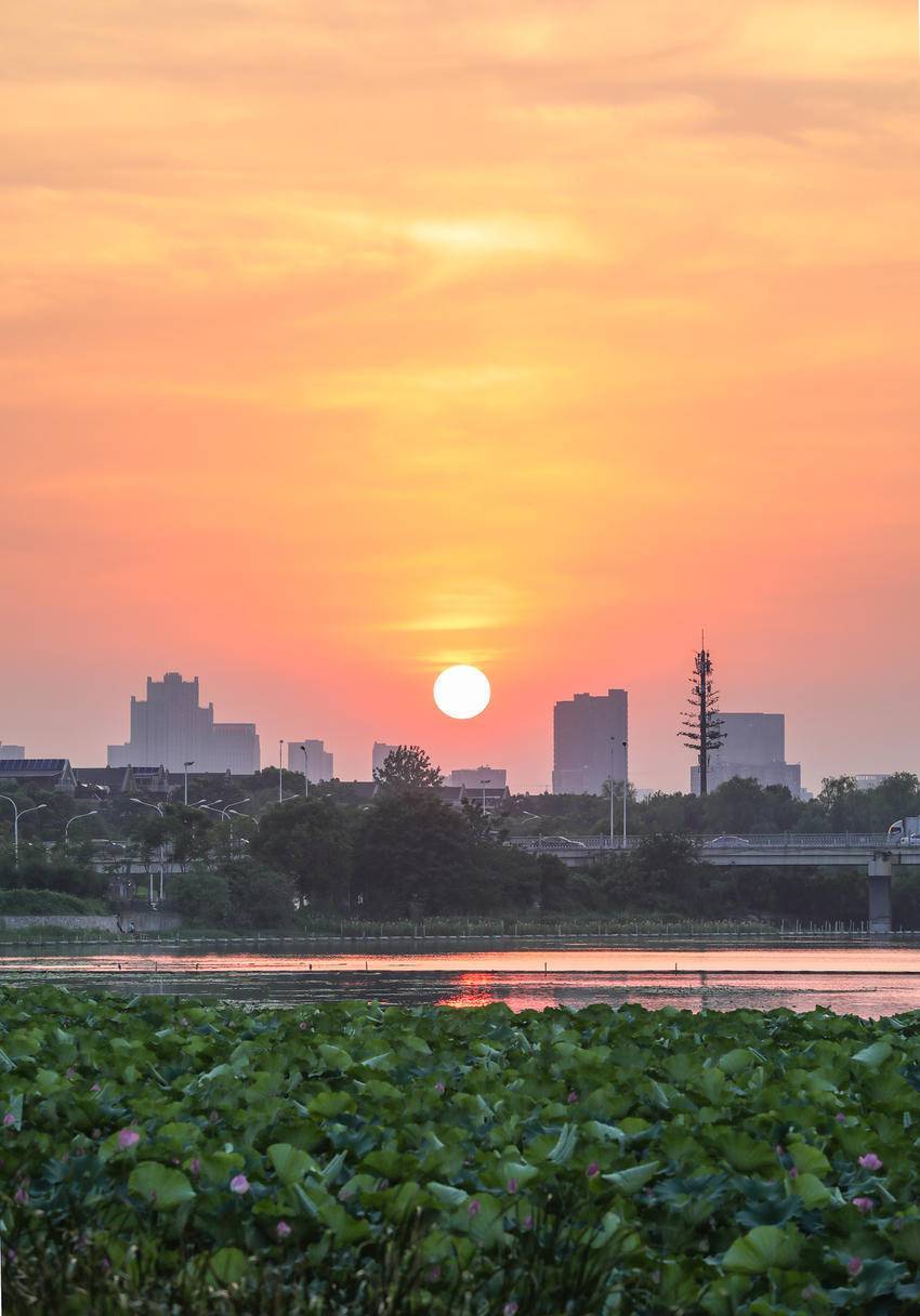近日,位于汉阳区墨水湖南岸边的荷花迎着骄阳相继盛放,一朵朵随着微风摇曳,娇艳夺目。夕阳西下时,一轮红日从西边的半空缓缓落下,霞光映在墨水湖中,甚是美丽。俏丽的荷花,橙色的夕阳,吸引着附近居民前来赏荷看夕阳。