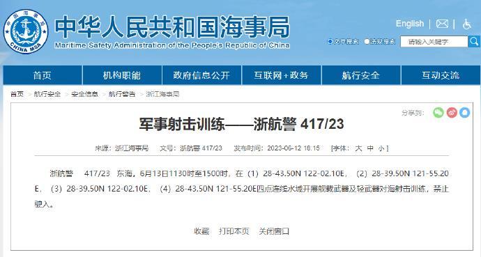 据中国海事局网站消息,浙江海事局发布航行警告,6月13日11时30分至15时,东海部分海域开展舰载武器及轻武器对海射击训练,禁止驶入。