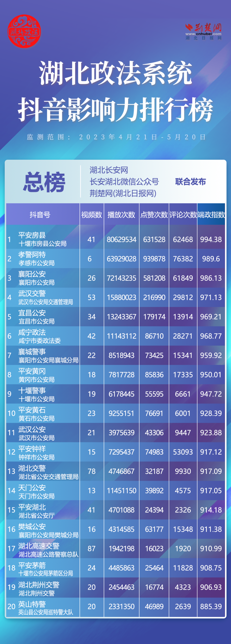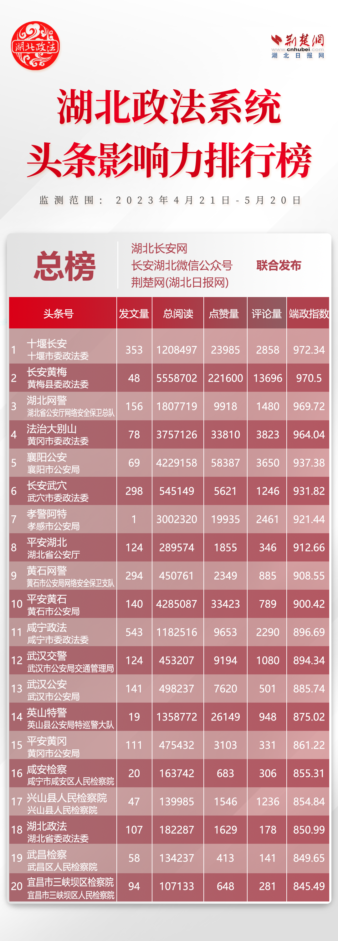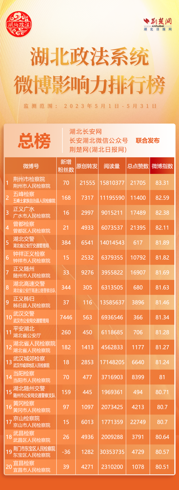 6月13日,湖北省委政法委官网湖北长安网、官微长安湖北,联合荆楚网(湖北日报网)、楚天舆情数据研究院发布湖北政法系统新媒体影响力排行5月榜单。具体榜单如下: