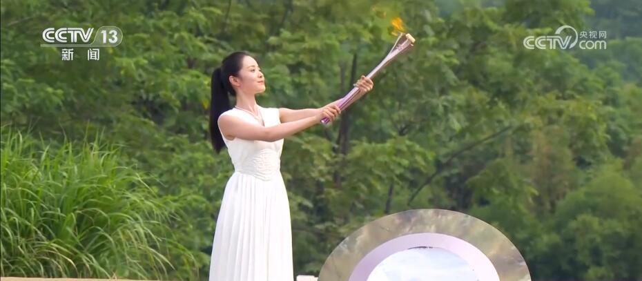 这个数字寓意着第19届亚运会。其中⼀名采火使者⼿持采⽕棒,缓缓走向采火装置。采火装置的外形是⼀枚良渚玉璧,中间放置的⼀⾯凹⾯镜,采⽕使者将采⽕棒伸向采⽕装置。古⼈发明的这种采火⽅式,也充分体现了⼈类的智慧。