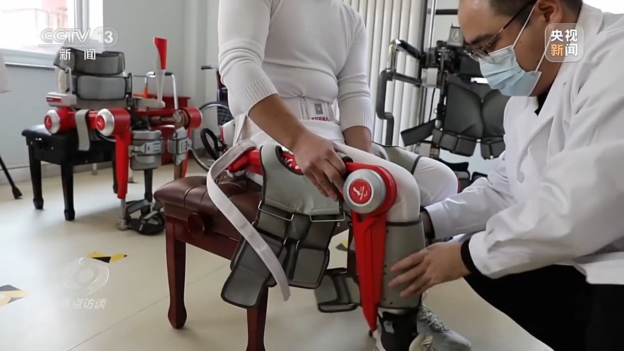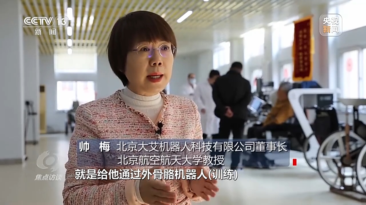 北京大艾机器人科技有限公司董事长、北京航空航天大学教授帅梅:“就是通过外骨骼机器人训练,来给他建立正确的行走模式,以及正确的本体感觉,让他能重新行走。”