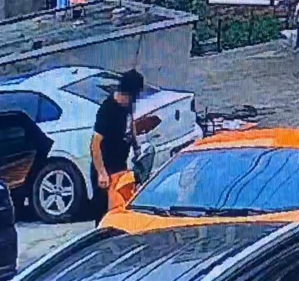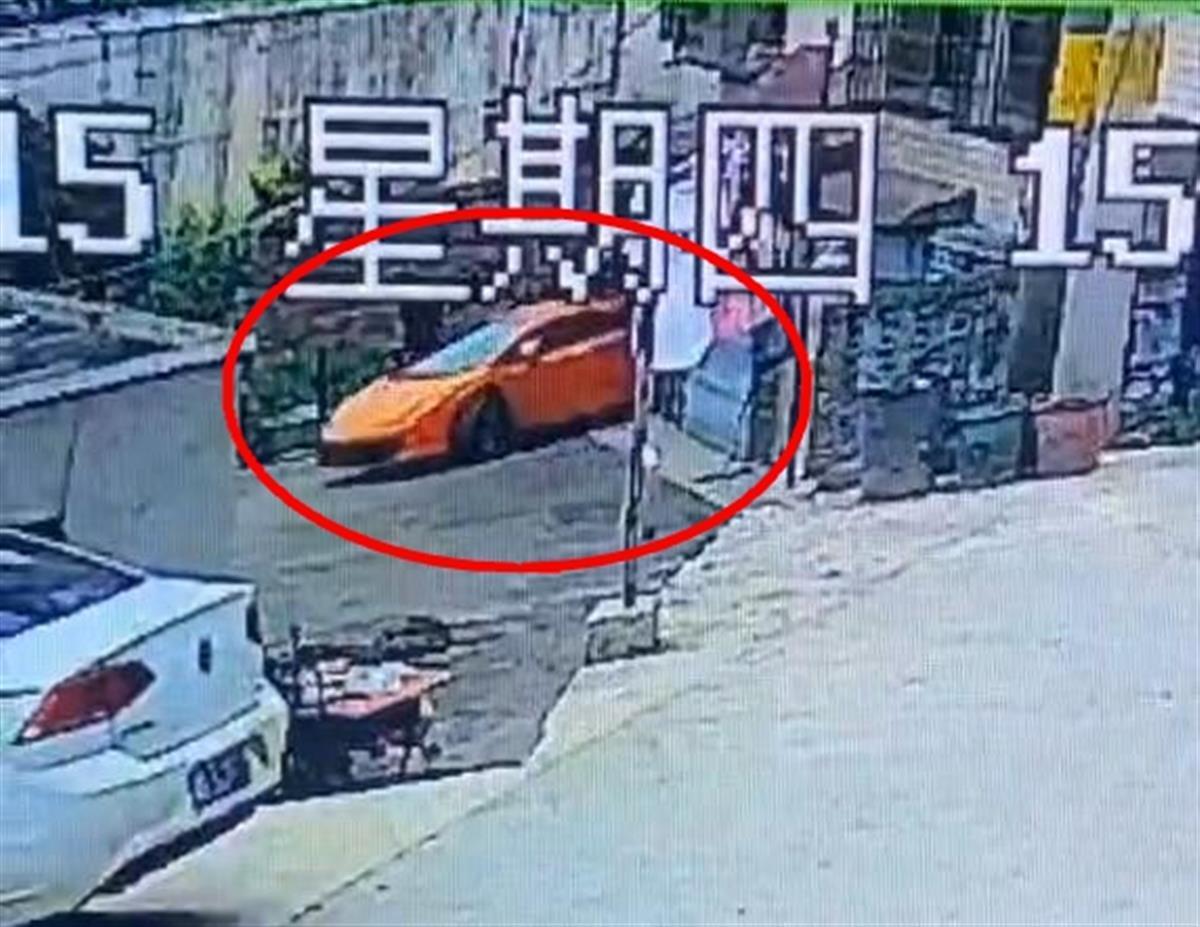 现场监控视频显示,两名黑衣男子从一辆黑色轿车处走出,一前一后向同一方向走去,后面一名男子疑似被人叫住,转头向一名男子出示了证件,随后继续走到一栋楼下。几人在楼下待了一会,一辆橙色跑车从楼下门内驶出。
