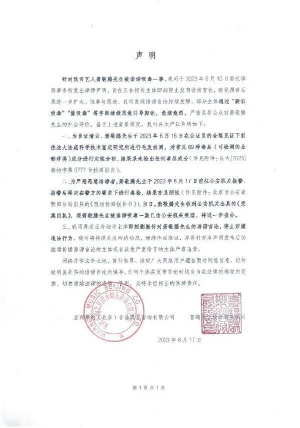 17日,@萧敬腾工作室发布声明称,我司艺人萧敬腾先生坚决遵守国家法律法规,严于律己。网络并非法外之地,我司对网络诽谤造谣零容忍!诽谤事件发生后,我司及时联系权威检测机构进行毛发检测,结果显示未检出任何毒品成分,并在与律师团队商议后,决定做报警处理,希望这场网络诽谤就此终止,也希望大家可以共同维护网络环境健康良好发展,坚决抵制造谣诽谤行为!