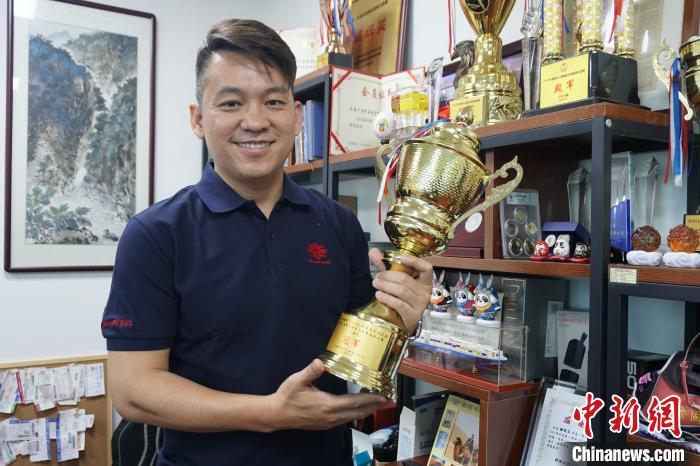 钟捷名展示篮球队成立以来获得的荣誉。 中新社记者 孙权 摄
