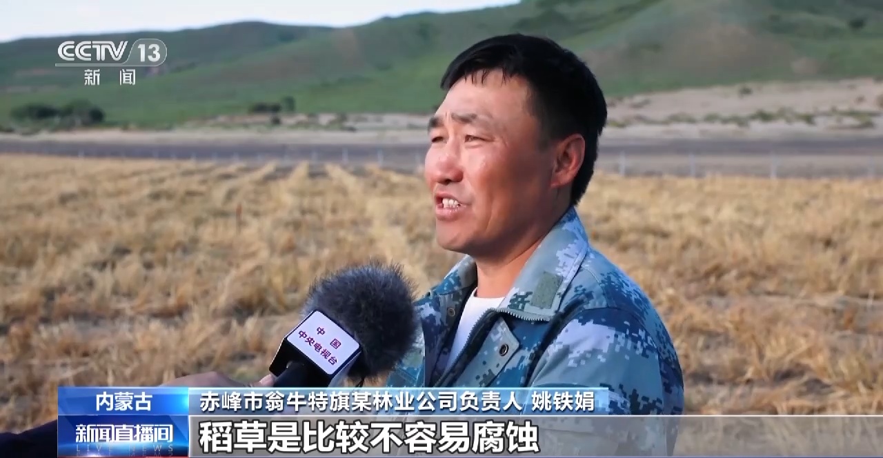 赤峰市翁牛特旗某林业公司负责人 姚铁娟:稻草是比较不容易腐蚀,用这个主要为了草方格中间飞播种子,飞播种子之后(长出的)草能起到防止大风刮起沙子(的作用)。