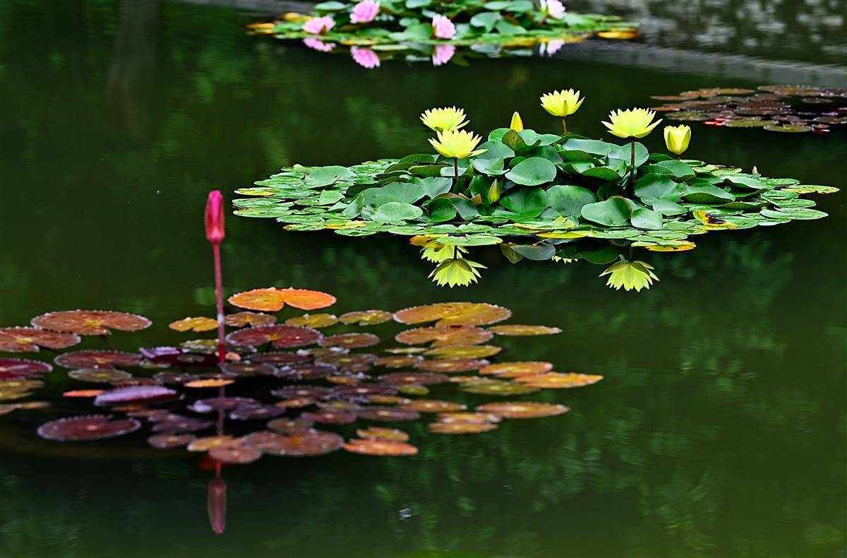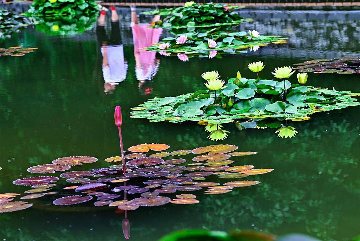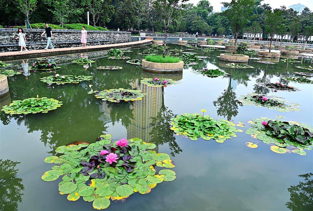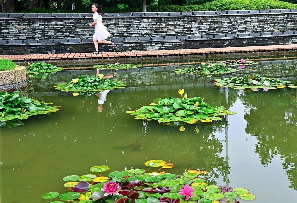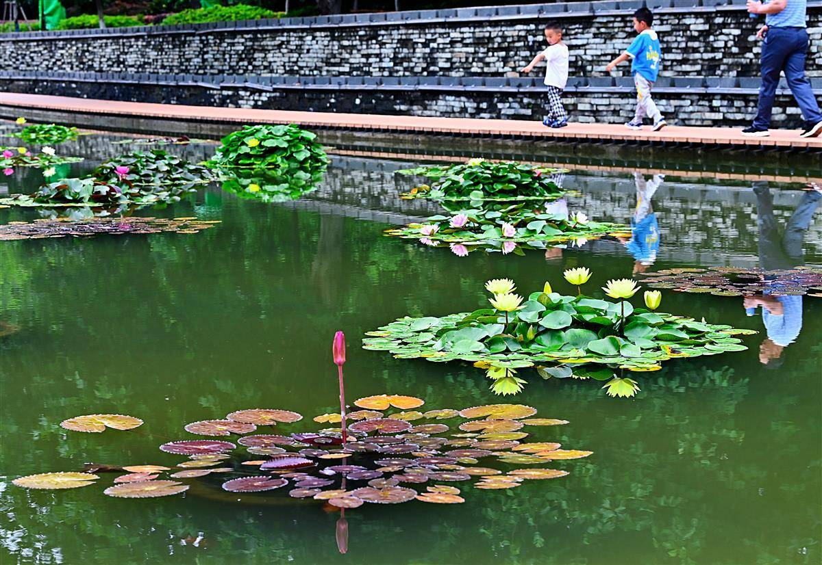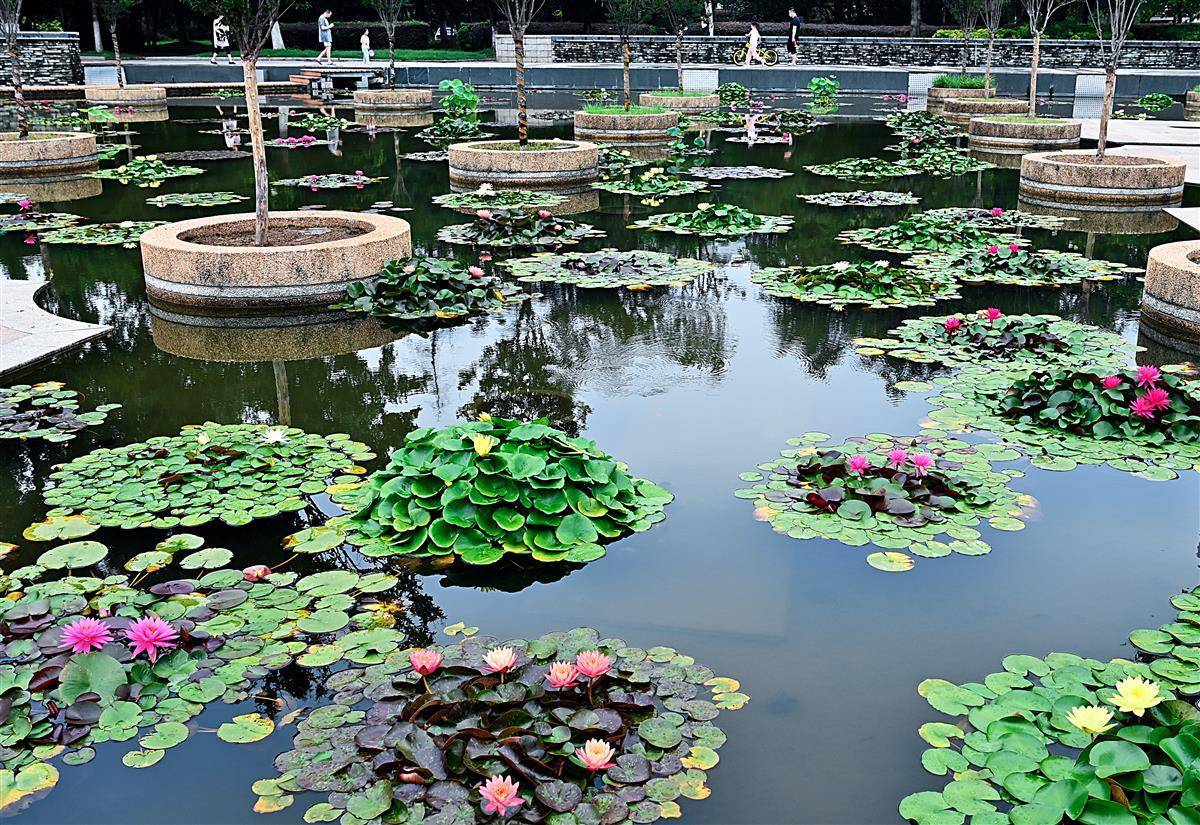 这是武汉市园林部门打造的百莲池。为了让一池之景疏密有致,舒展自然,他们进行了巧妙搭配,精心挑选红色闪耀、印度红、埃及白、万维莎等多个睡莲品种,将一盆盆颜色各异,姿态相殊的植株在宽阔池面错落摆放。(湖北日报全媒记者朱熙勇摄)