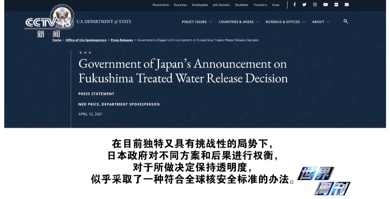 而就在日本政府公布排海计划的前一天,2021年4月12日,美国国务院在官网发表一份相关声明,措辞可谓用心良苦: