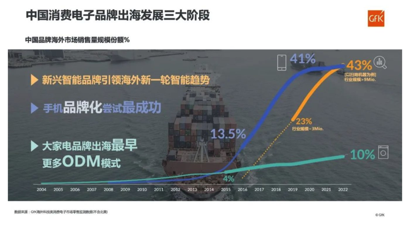 如今,中国品牌,世界共享,这一趋势已不可逆。每一个亮眼的数据背后,都是中国品牌走向世界不断突破的见证。纵观全球消费电子市场,2022年,中国品牌贡献了37%的销售额,中国智能产品渗透率更是达到57%。其中,来自中国的手机和扫地机器人品牌在海外市场的销量占比均达到43%。