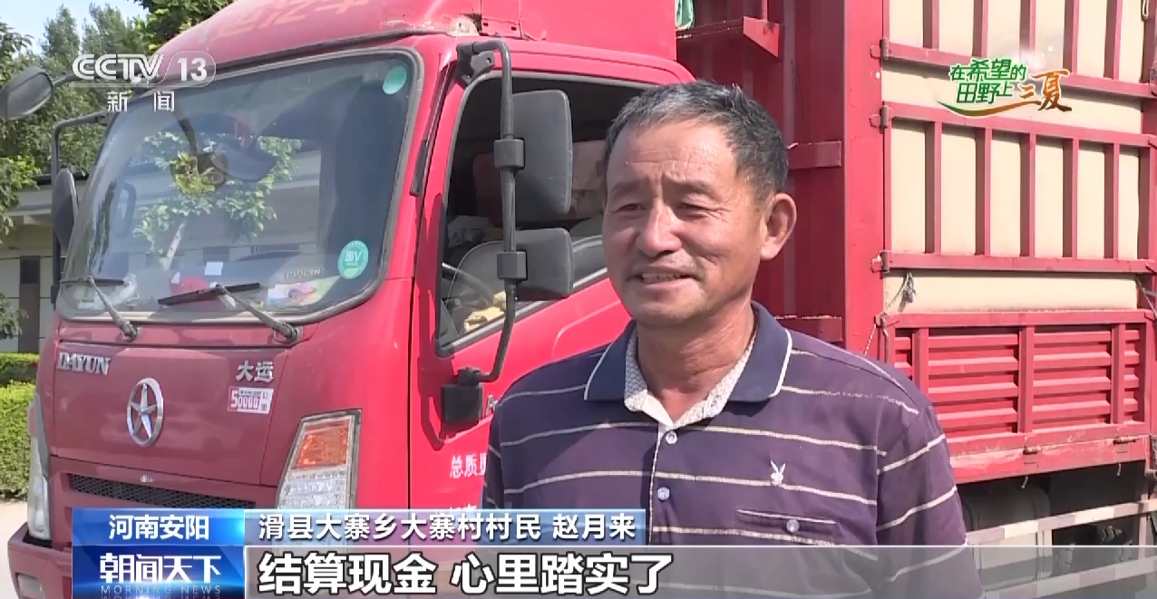 河南滑县大寨乡大寨村村民 赵月来:今年我种了十来亩地,一亩地1200多斤小麦,打了1万多斤,今天卖完了,把钱取到手里了,结算现金,心里踏实了。