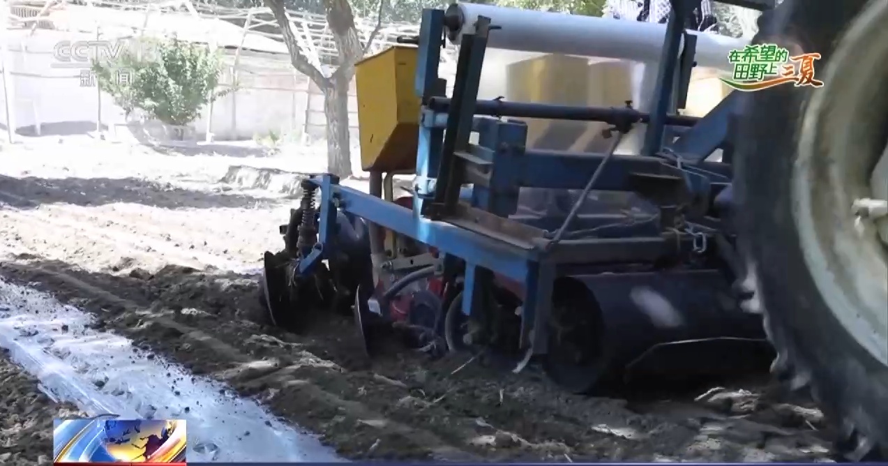 6月16日,在莎车县塔尕尔其镇斯也克村的农田里,精播机正隆隆作响,在农田里来回穿梭,不一会儿工夫,一大片复播玉米就播种完毕。