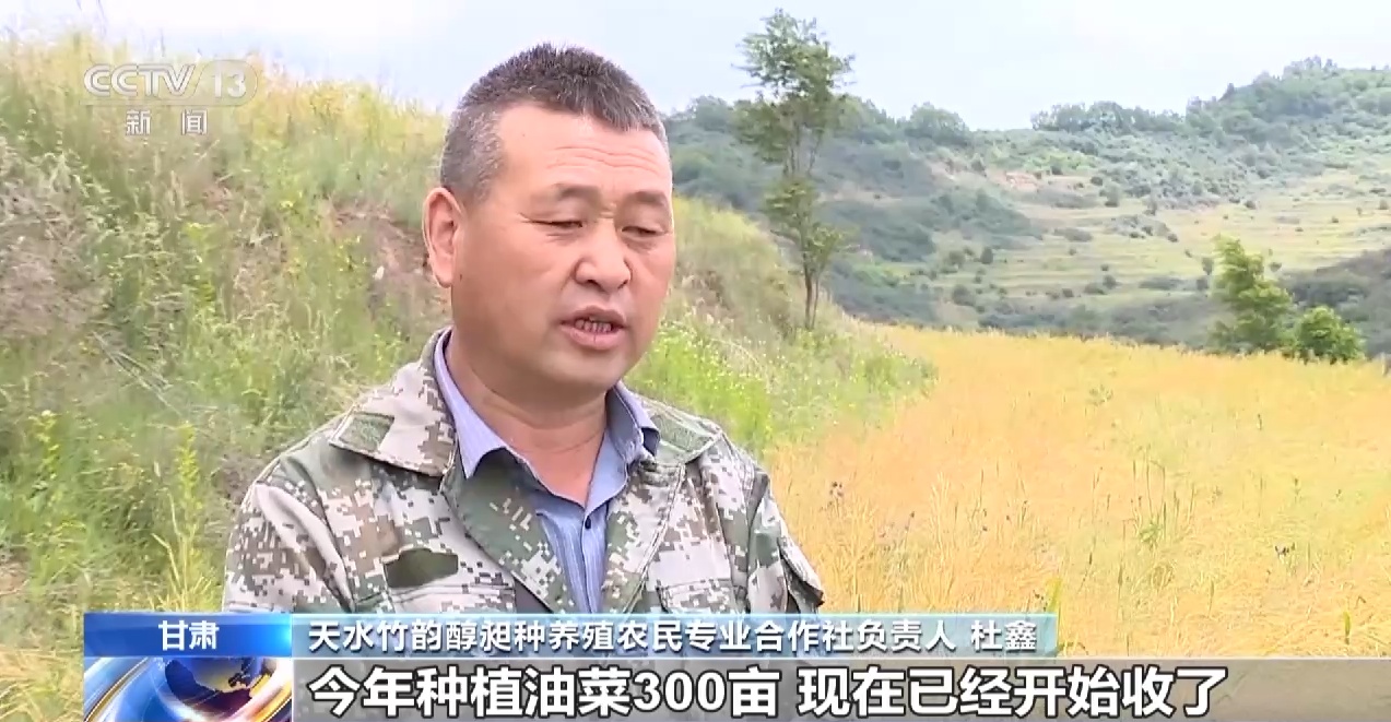 甘肃天水竹韵醇昶种养殖农民专业合作社负责人 杜鑫:今年种植油菜300亩,现在已经开始收了,颗粒饱满,色泽鲜艳,通过农技站的技术人员定期到地里进行田间管理,我们今年的油菜产量和质量比去年有了更大提升。