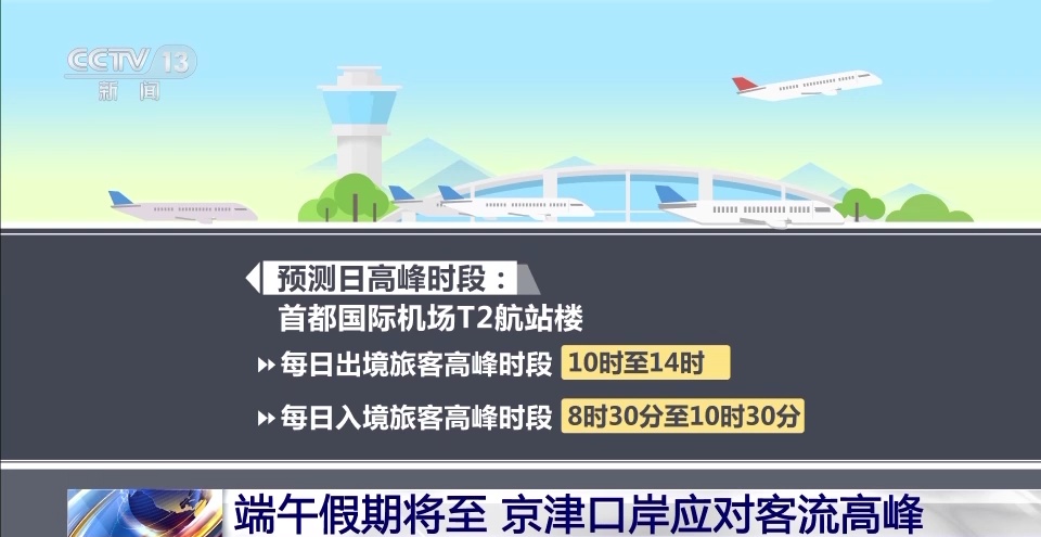根据北京边检总站预测,6月22日至6月24日端午假期结束,北京口岸节日期间出入境旅客量将超过9万人次。6月21日至22日为出境高峰,日均出境旅客量1.6万人次;6月24日至25日为入境高峰,日均入境旅客量1.5万人次。