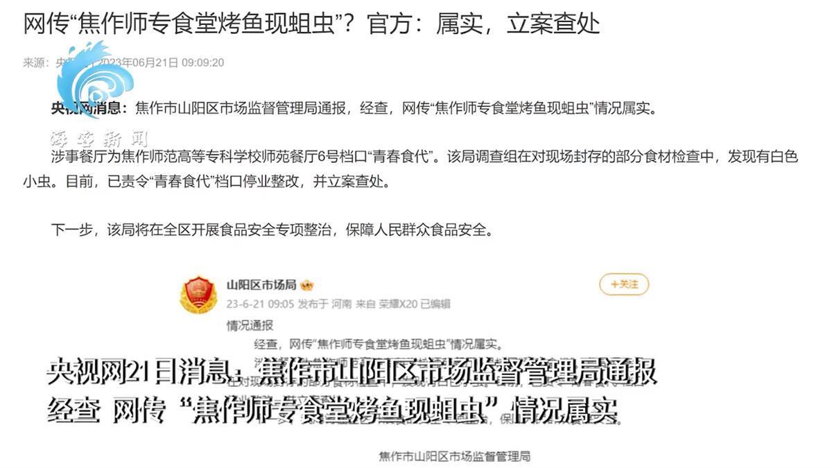 最近,一个关于焦作师范学院的食堂情况的帖子在网上引发公众广泛关注。据学生爆料,他在该校食堂就餐时惊讶地发现,烤鱼上竟然有一只蛆虫在爬动。6月21日,焦作市山阳区市场监督管理局发布情况通报,经查,网上所传情况属实,目前,已责令涉事档口停业整改,并立案查处。(据6月21日海客新闻)
