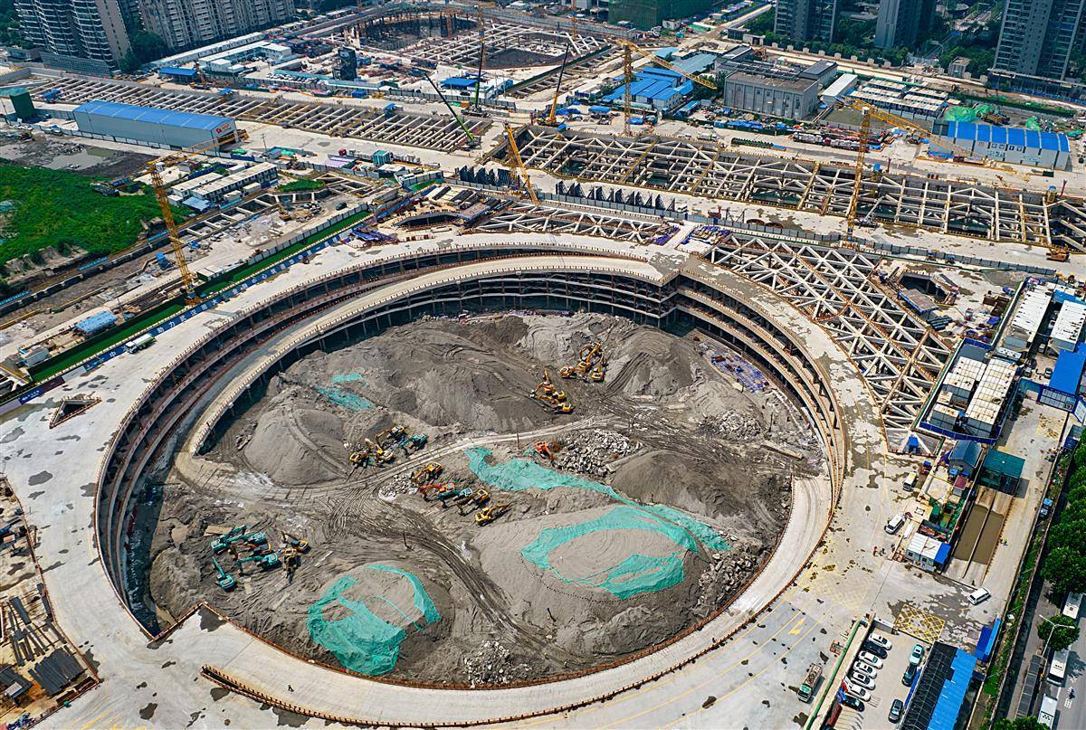 高475米的摩天大楼项目——武汉周大福金融中心,目前正在进行巨型基坑的开挖工作,土方开挖和清运的施工机械众多,一片热火朝天的景象。