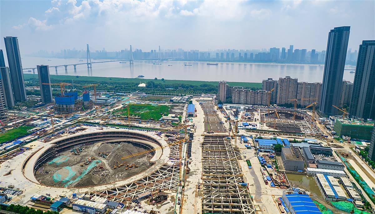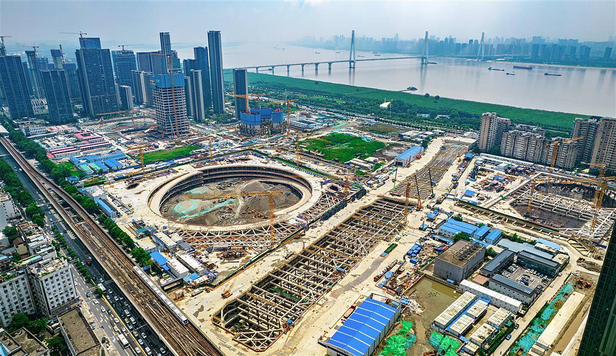 6月20日,鸟瞰武汉市江岸区汉口滨江国际商务区,周大福金融中心、泰康金融中心、二七过江隧道等20个重大项目建设正如火如荼推进之中。